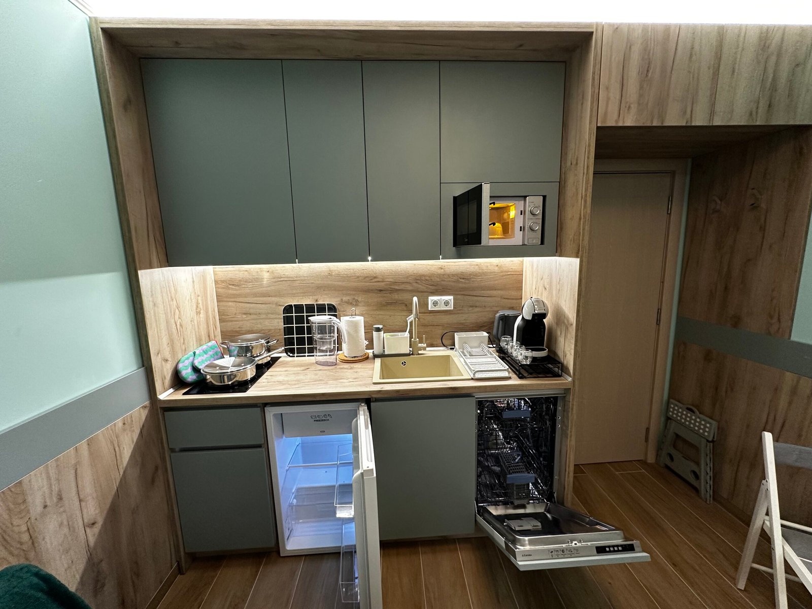 Each studio is equipped with a king-size bed, living area, kitchen with all necessary appliances, and a spacious bathroom.