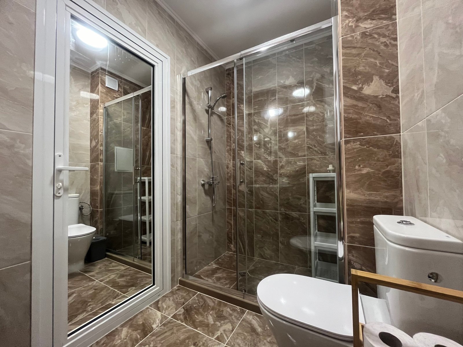 Enjoy a refreshing shower after a day at the beach in the generously sized enclosed shower with rainfall showerhead, offering spa-like comfort.